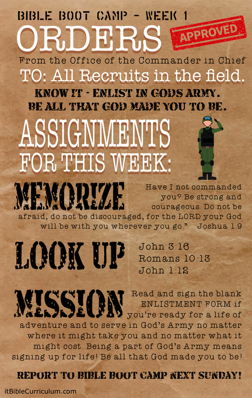 Welcome to BIBLE BOOT CAMP! Get ready for some intensive training in how to live a VICTORIOUS LIFE for the Commander in Chief, GOD!
