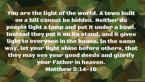 It is very important for a solider to have a flash light when they go in to battle. A soldier can find their way in a dark situation – and light the way for others as well. The same is true for Christians. You might not think your light is very bright, but think about it, the brighter our light, the more we can point the way to God. But it’s also true that if we are in a dark place, even a small light can point the way to safety. You might think “I’m just a kid” but if you are the one with a light, you can still lead others to Jesus! That's why Jesus wants to SEND YOU into the world to tell about the Good News of Jesus!