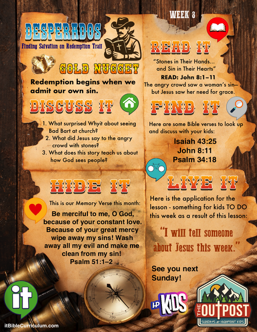 This week, kiddos learn that when we admit our wrongs, Jesus offers a fresh start—and we oughta show that same grace to others, too. Yeehaw for redemption!