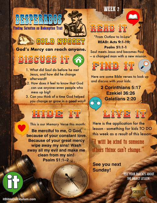 Howdy, partners! This week we hit the trail with a wild story about a fella named Saul—an outlaw who didn’t just rob banks… he was wranglin’ up Christians! But on his way to cause more trouble, God stopped him in his tracks with a flash of heavenly light and a voice straight from the sky. That voice? It was Jesus! After three days of blindness and a whole lotta thinkin’, Saul got his sight back, got baptized, and got a brand-new name: Paul. Our big truth this week was God’s mercy can reach anyone. If God could forgive and use a tough-as-nails guy like Saul to share the Good News, He can use any one of us too—even folks others think can’t change. So don’t judge a cowboy by his boots, partner… God’s got plans for everyone on the trail!