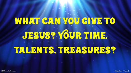 Ask yourself, what can you give to Jesus? Your time, talents, treasures? How do you think Jesus could use YOU to be a blessing to others?