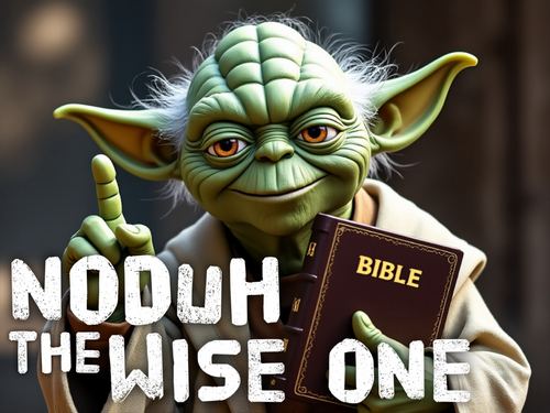 Noduh, the Wise One, reads Scripture. Not to be confused with his cousin, Yoda of Star Wars fame – a truly lost soul who believes in that silly “Force” – Noduh, the Wise One, believes in and follows the One True God, Yahweh, and shares Wisdom from the Holy Bible to help you become as wise as he is because, after all, following God, is like, Noduh! “If powerful Christian, you wish to be, listen to wisdom from Noduh, that’s me!”